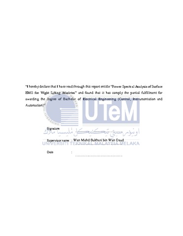 Muhammad Azri, Omanap (2015) Power Spectral Analysis Of Surface EMG Of Surface EMG For Weight Lifting Atheletes. Project Report. Universiti Teknikal Malaysia Melaka, Melaka, Malaysia. (Submitted)