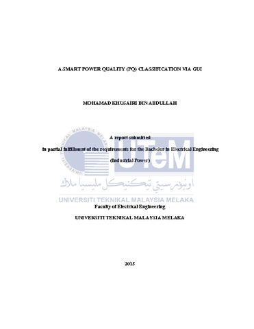 Mohamad Khusairi, Abdullah (2015) A Smart Power Quality (PQ) Classification Via GUI. Project Report. UTeM, Melaka, Malaysia. (Submitted)