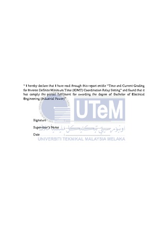 Mohd Hafiz, Rosli (2015) Time And Current Grading For Inverse Definite Minimum Time (IDMT) Coordination Relay Setting. Project Report. Universiti Teknikal Malaysia Melaka, Melaka, Malaysia. (Submitted)