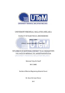 Muhamad Yahya, Raziff (2015) Influence Of Moisture Content To AC Breakdown Voltage Of Mineral Oil Based Nanofluids. Project Report. Universiti Teknikal Malaysia Melaka, Melaka, Malaysia. (Submitted)