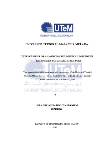 Abd Rahim, Nur Azmina Izzati (2016) Development of an automated medical dispenser reminder system architecture. Project Report. Universiti Teknikal Malaysia Melaka, Melaka, Malaysia. (Submitted)
