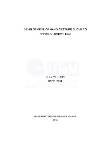 Ghee, Yih Farn (2016) Development of hand gesture glove to control robot arm. Project Report. Universiti Teknikal Malaysia Melaka, Melaka, Malaysia. (Submitted)