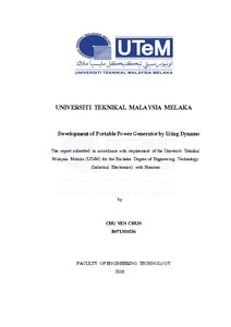 Chu, Yen Chun (2016) Development of portable power generator by using dynamo. Project Report. Universiti Teknikal Malaysia Melaka, Melaka, Malaysia. (Submitted)