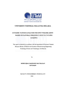 Mat Hassan, Mohd Iqbal Hakim (2016) Dynamic fatigue analysis for spot welded joint based on natural frequency due to cycling loading. Project Report. Universiti Teknikal Malaysia Melaka, Melaka, Malaysia. (Submitted)
