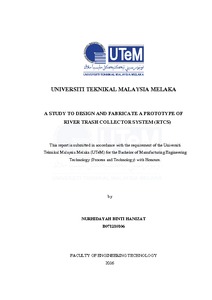 Hanizat, Nurhidayah (2016) A study to design and fabricate a prototype of River Trash Collector System (RTCS). Project Report. Universiti Teknikal Malaysia Melaka, Melaka, Malaysia. (Submitted)