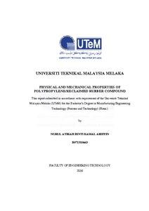 Kamal Ariffin, Nurul Atirah (2016) Physical and mechanical properties of polypropylene-reclaimed rubber compound. Project Report. Universiti Teknikal Malaysia Melaka, Melaka, Malaysia. (Submitted)