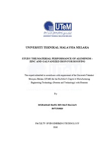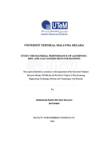 Mat Hassan, Muhamad Hafis (2016) Study the material performance of aluminum - zinc and galvanized iron for roofing. Project Report. Universiti Teknikal Malaysia Melaka, Melaka, Malaysia. (Submitted)