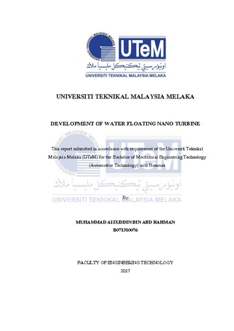 Abd Rahman, Muhammad Aizuddin (2016) Development of water floating nano turbine. Project Report. Universiti Teknikal Malaysia Melaka, Melaka, Malaysia. (Submitted)