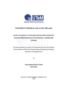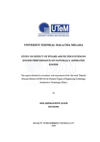 Jusoh, Nur Ajeerah (2016) Study on effect of intake air filter system on engine performance on naturally aspirated engine. Project Report. Universiti Teknikal Malaysia Melaka, Melaka, Malaysia. (Submitted)