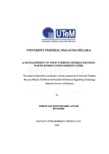 Khairil Anwar, Norliyana (2016) A development of wind turbine generator using waste energy for domestic user. Project Report. Universiti Teknikal Malaysia Melaka, Melaka, Malaysia. (Submitted)