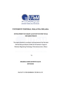 Md. Jani, Khairul Bariyah (2016) Development of smart assist device for visual impaired person. Project Report. Universiti Teknikal Malaysia Melaka, Melaka, Malaysia. (Submitted)