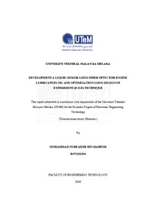 Mahfor, Muhammad Nurfaidhi (2016) Development a liquid sensor using fiber optic for engine lubrication oil and optimization using Design Of Experiment (D.O.E) technique. Project Report. Universiti Teknikal Malaysia Melaka, Melaka, Malaysia. (Submitted)