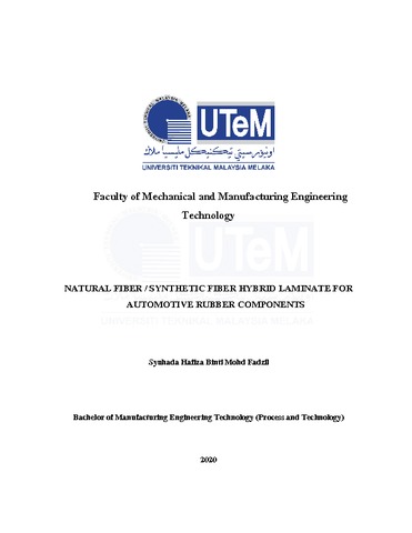 Mohd Fadzil, Syuhada Hafiza (2020) Natural fiber synthetic fiber hybrid laminate for automotive rubber components. Project Report. Universiti Teknikal Malaysia Melaka, Melaka, Malaysia. (Submitted)